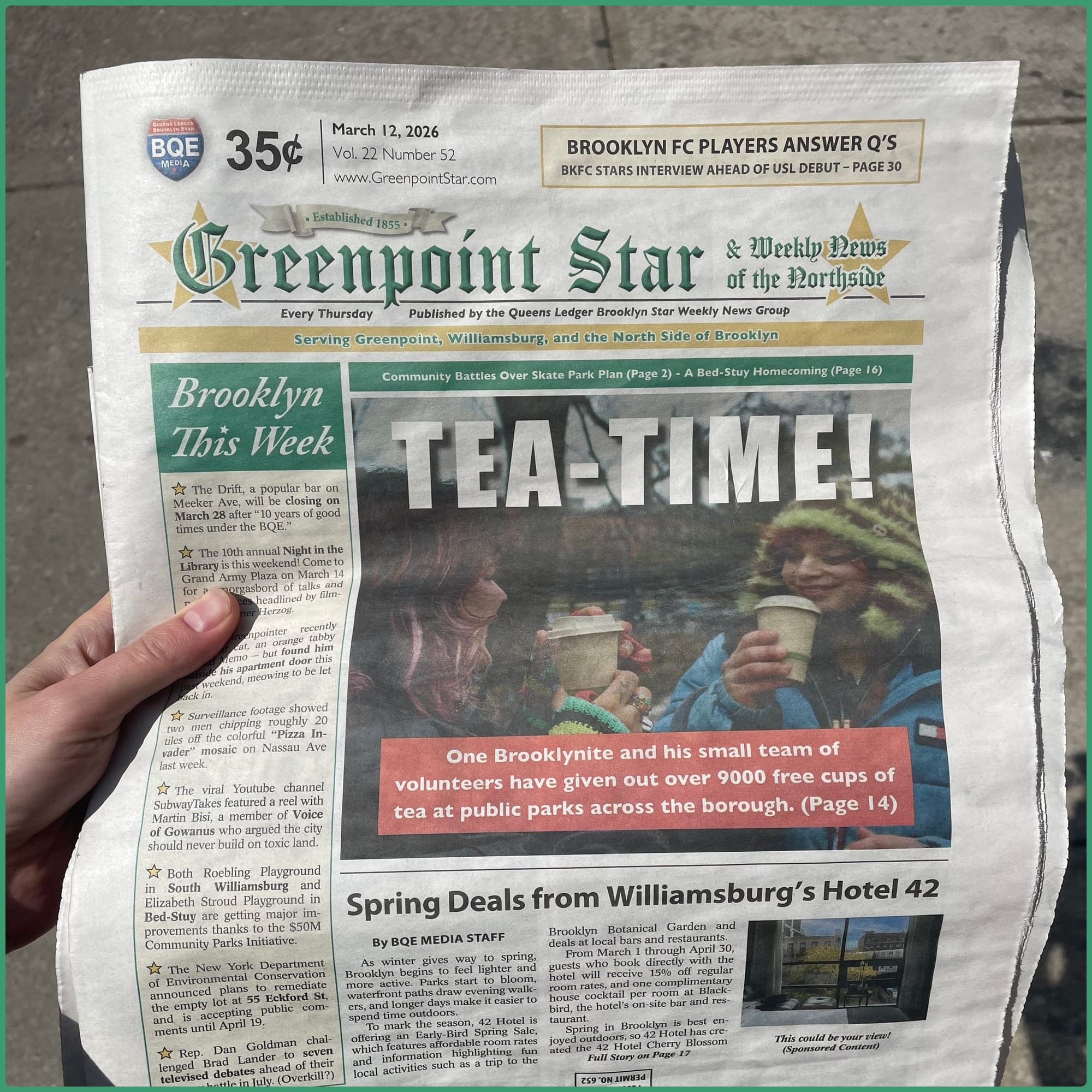 A couple weeks ago, Jacqui's story about The Tea Stand was published in the Brooklyn Downtown / Greenpoint Star (I'm still not sure what the difference is). And the best part β it's a physical newspaper, and we're on the cover!