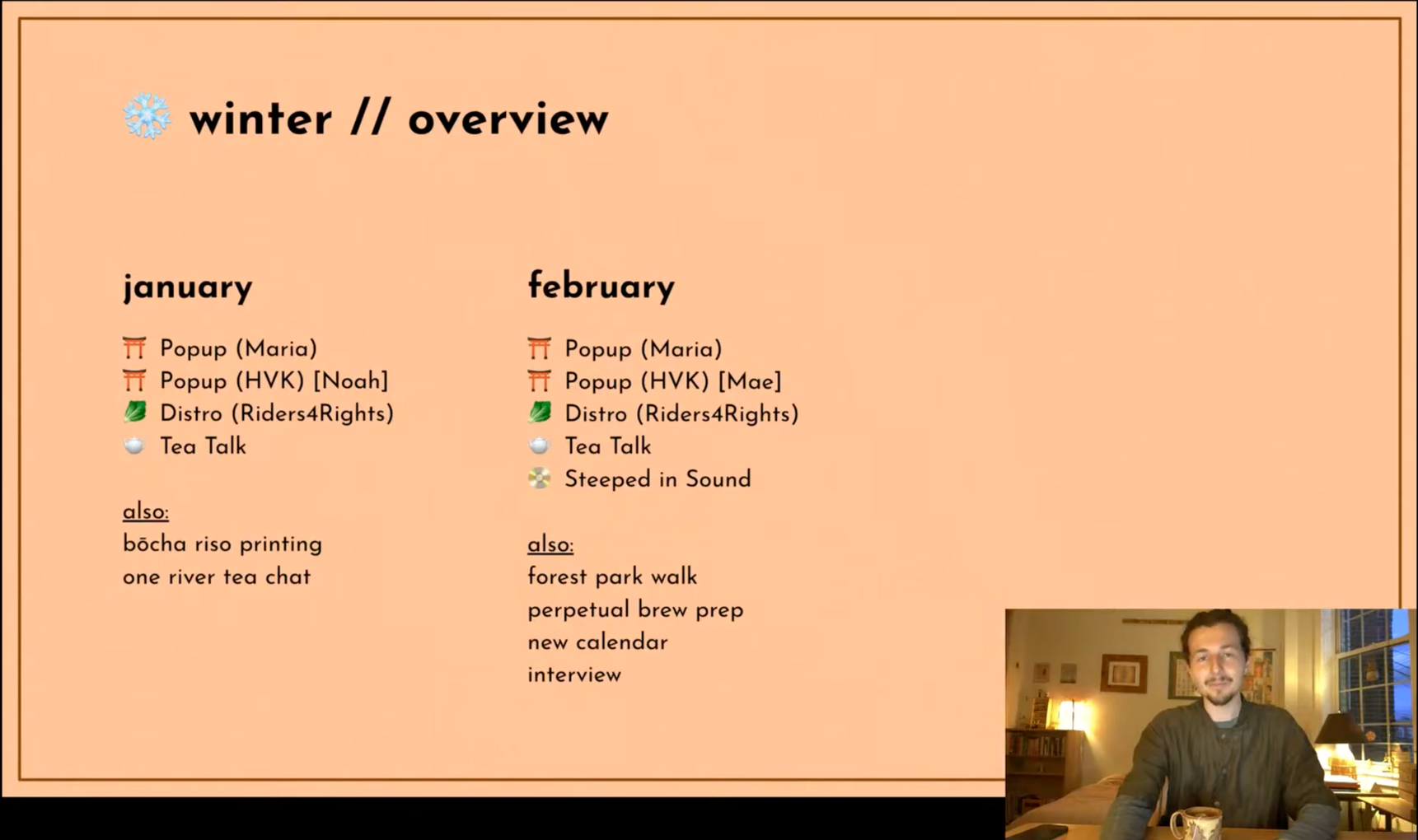These Town Halls are open to all members β Sippers & Steepers alike β and serve as opportunities to share seasonal reflections, important events & collaborations, financial updates, and whatever else is going on in the world of The Tea Stand.