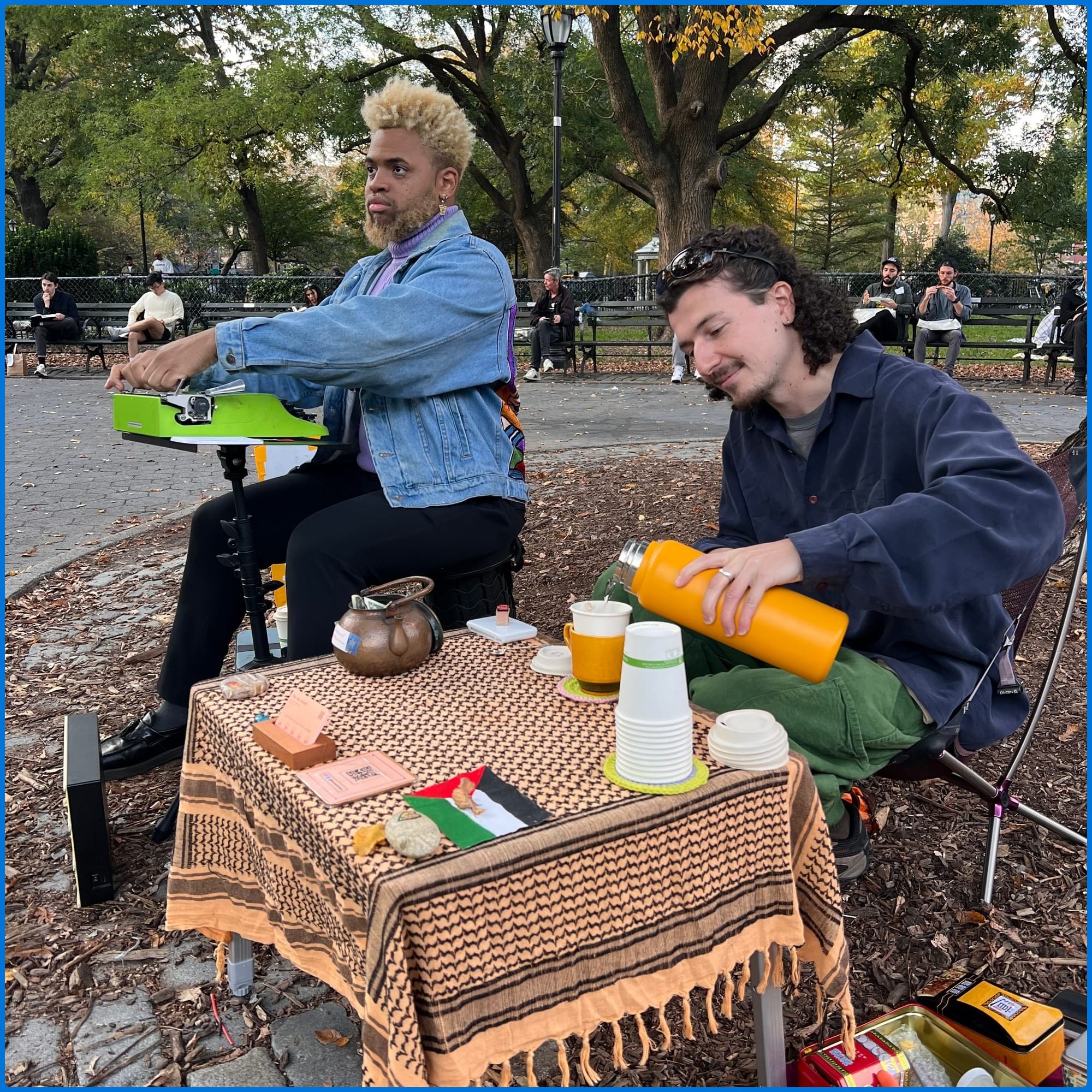 ๐ช April 15: the day began with sun and warmth and tentative tea drinkers stopping by. waves of park goers trickled in, passing by the tea stand like gentle breezes. bob stopped by, then jw, and soon juno, and while they chattered, more folks came by to grab some tea before they headed to work, or as they walked home. the park is an intersection, of timelines, of jobs, of class, of culture. more friends came; liam on his birthday, kena making birthday cards, sam on his lunch break. new friends, too; ziggy and julie and max the big dog in the little red wagon. it was a joy. soon the winds came, and ruth told her stories, and rain pitter pattered, and the birds sang. and then the sun, again, and the golden light of dusk, and miles to wrap it all up. just one last cup of tea for felipe and daniel. what a day! [Written by John]