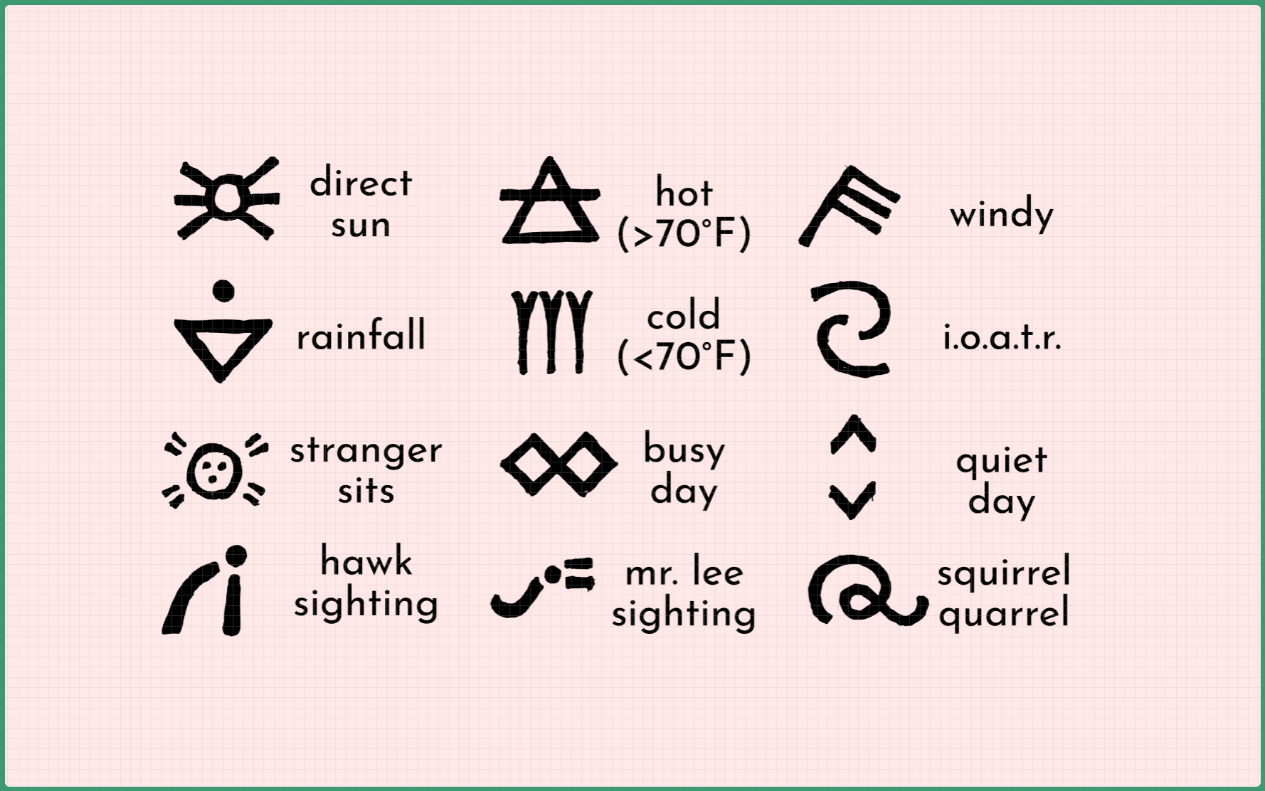 A vision crystallized quickly: we shall create set of symbols, each representing an event that may or not take place on a given day of Perpetual Brew (e.g. seeing a hawk, a rain droplet falling), and use this as a way to archive the month.